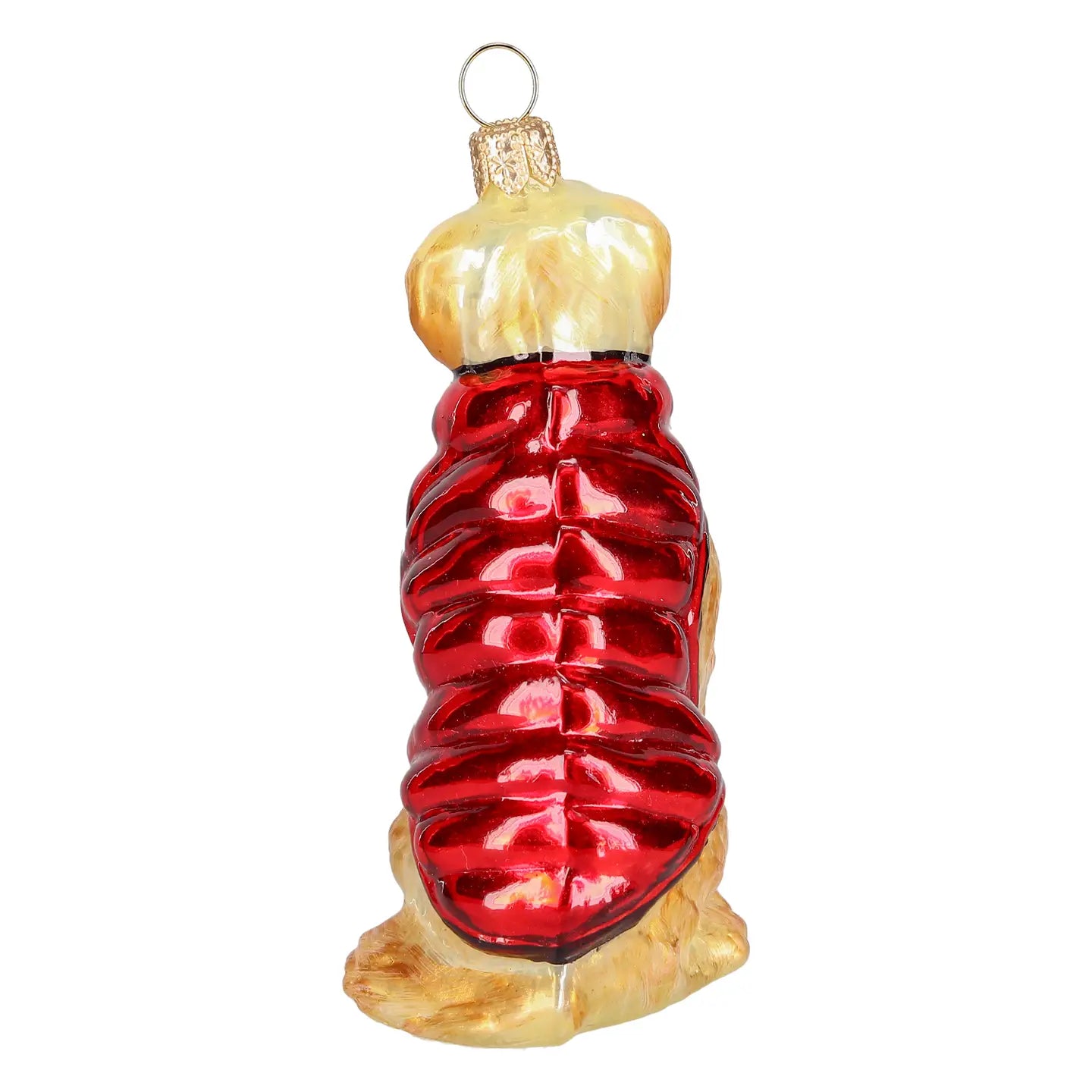 Embrace the gentle luxury of our exquisite glass Golden Retriever Ornament! This darling canine gem, wrapped in a plush red quilted vest, exudes sweet aristocratic allure with its radiant golden sheen. A tender statement for your tree, it glows with soft sophistication, or makes a treasured gift for the kind-hearted connoisseur.