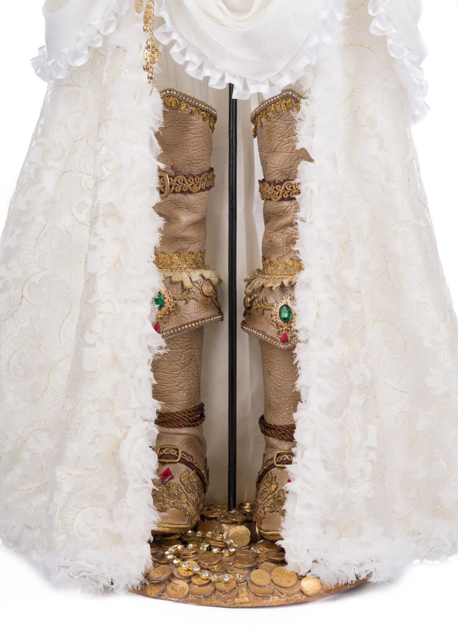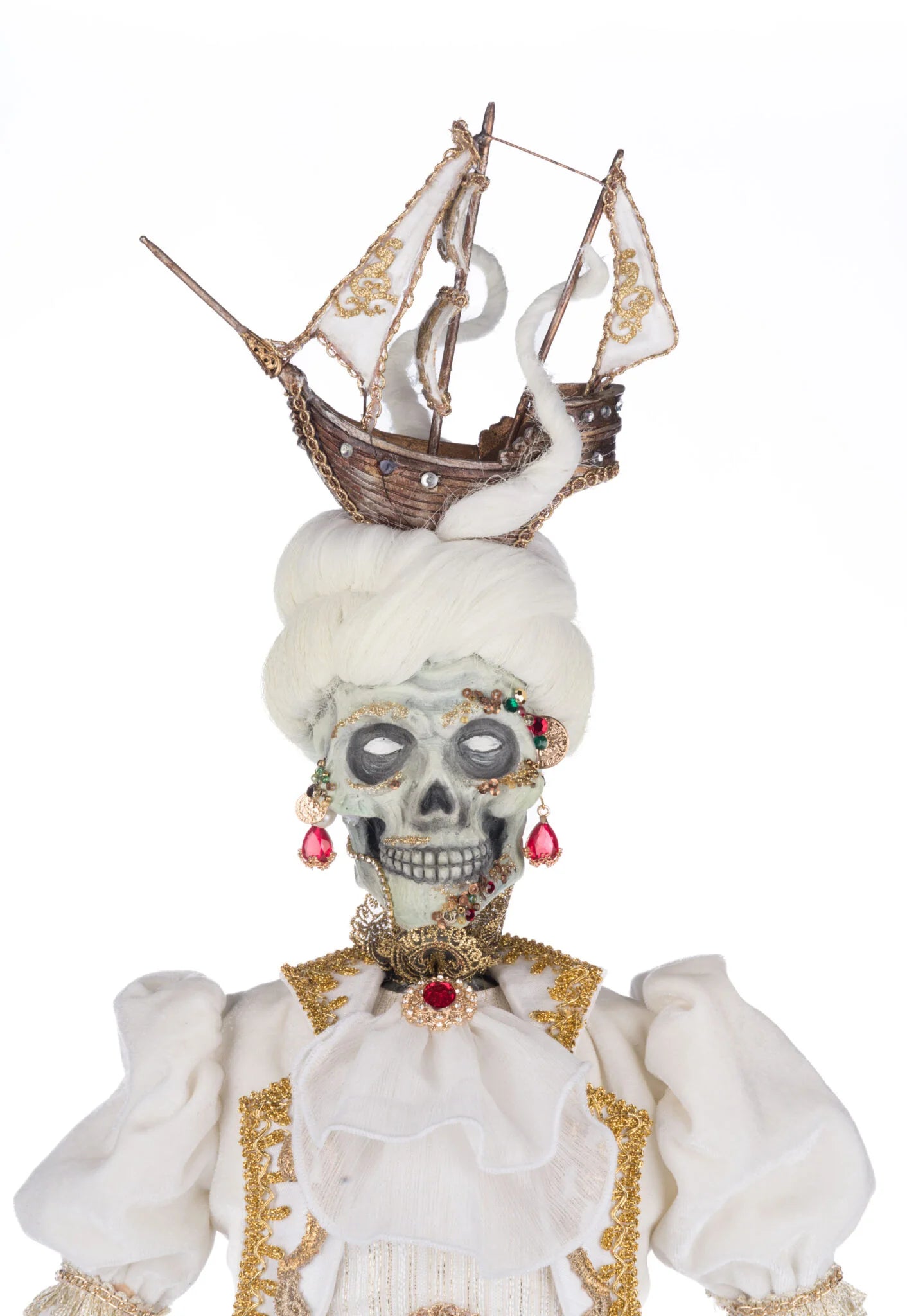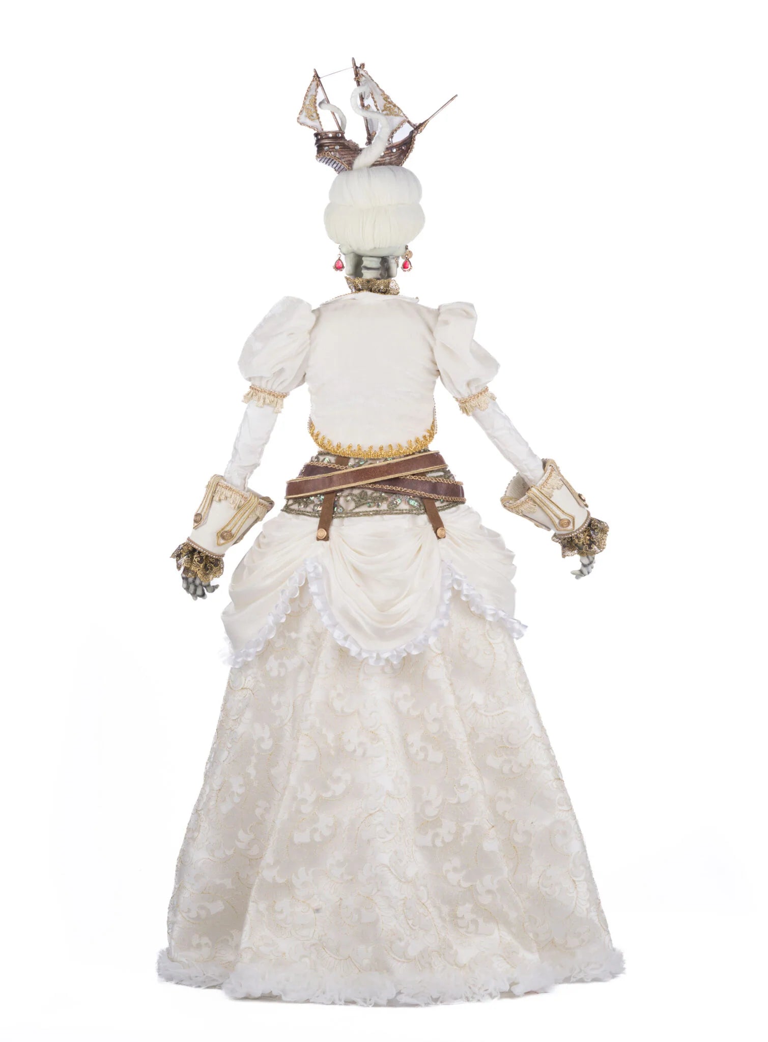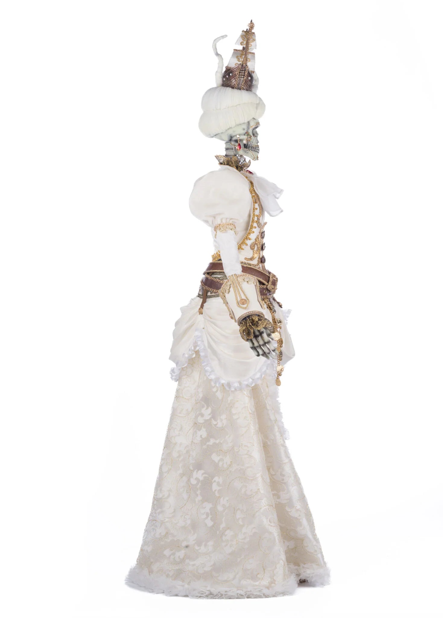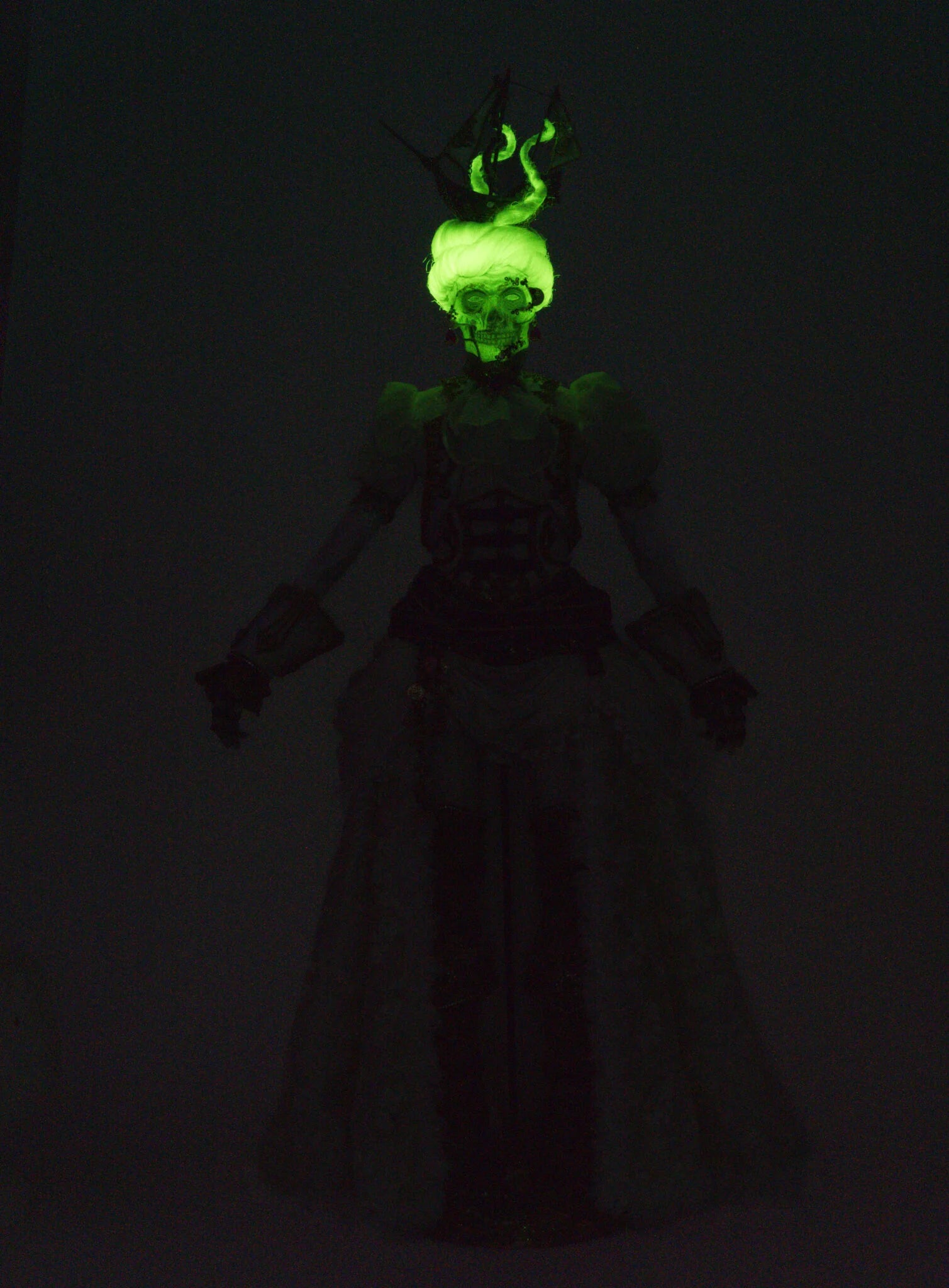 Adorned in an opulent gown with golden accents and a miniature ship crown, her face and swirling hair gently glow in the dark, casting an ethereal light. This striking masterpiece brings a bold and otherworldly elegance to your holiday decor!