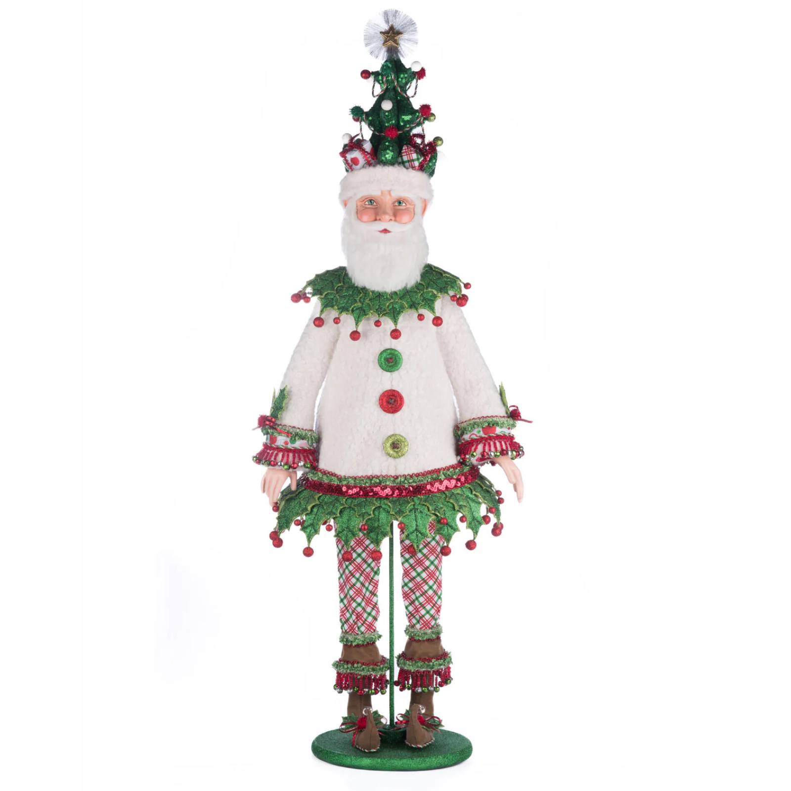 This sculpted, hand-painted doll blends festive cheer with artistic flair! Dressed in a whimsical white outfit with green and red accents, this Santa features a playful tree-topper hat and jingle-bell details. His intricately painted pants and boots add charm, making him a standout for holiday decor and a joyful seasonal display.
